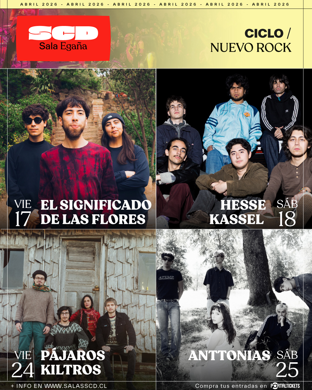 La nueva generación del rock chileno tiene un espacio protagónico durante abril en Sala Egaña. El ciclo “Nuevo Rock” congrega a cuatro bandas que están renovando el género desde miradas diversas, apostando por sonidos actuales y una identidad propia. Los conciertos se desarrollarán entre el 17 y el 25 de abril y tendrán de protagonistas a El Significado de las Flores, Hesse Kassel, Pájaros Kiltros y Anttonias.